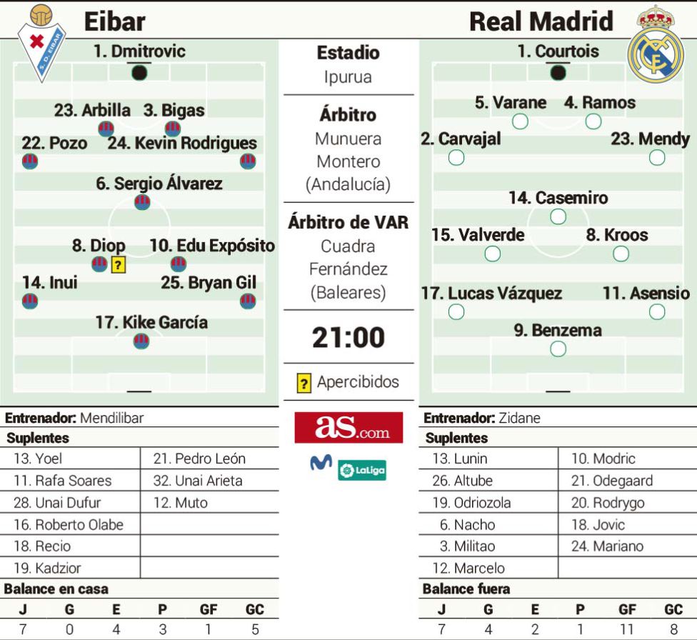"Pre Match Thread: Eibar vs Real Madrid - La Liga Matchday [--] ### Eibar(/r/sdeibar) vs Real Madrid(/r/realmadrid) ___ (#icon-clock) Match Time: 21:00 CET (#icon-net-big) Venue: Ipurua Futbol Zelaia(https://upload.wikimedia.org/wikipedia/commons/e/ec/Eibar1-0Lega20183.jpg) (#icon-whistle) Referee: Jos Munuera Montero (#icon-flag) Assistant Referee 1: Iigo Prieto Lpez (#icon-flag) Assistant Referee 2: Alfonso Baena Espejo ___ #Possible Line-ups from AS(https://as.com/futbol/imagenes/2020/12/19/primera/1608402153_266693_1608435556_sumario_grande.jpg) and"
