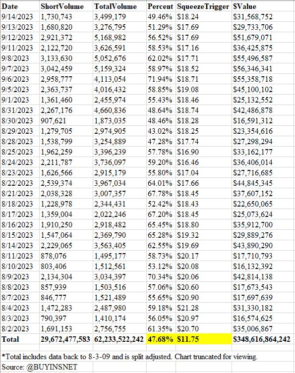 "@Tesla $TSLA Financial News $7 trillion bet against @elonmusk in past [--] years. [-----] billion total shares shorted at a volume weighted average price of $52.41. Most striking is 47.22% of the total trading volume (287.38 billion shares) is short selling. https://tinyurl.com/h5au98ft https://tinyurl.com/h5au98ft"