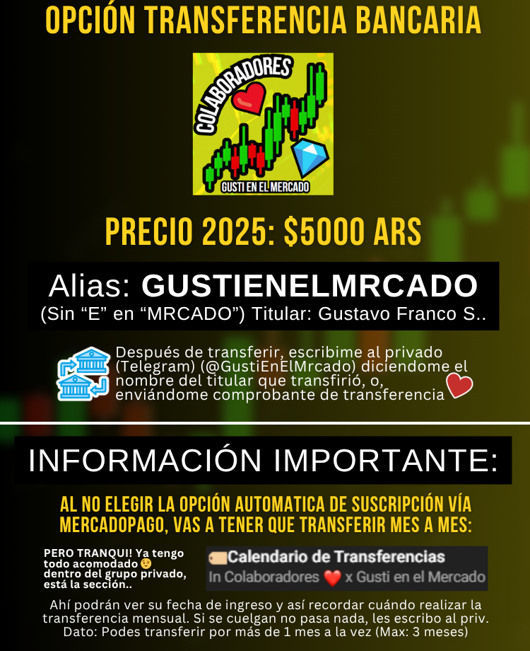 "14/11 TARDE EN RUEDA Timestamps de anlisis en el primer comentario. 📺"TARDE EN RUEDA" de Martes a Viernes 15hs (Anlisis didctico y sin humo) 📺"SBADO DE MANIJA BURSTIL" Sbados 12hs (Repaso burstil y bsqueda de oportunidades) 💬 Grupo TG Gratis 👉 https://t.me/TradingATP 💎 Grupo TG Privado: Acced con colaboracin simblica 👉 TRANSFERENCIA https://iili.io/KUNnrWQ.png 👉 MP https://www.mercadopago.com.ar/subscriptions/checkoutpreapproval_plan_id=177fb5339e314d109f5fef9c91683e47 💡 Ms info en la seccin "SER COLABORADOR (TG) 🌐 X 👉 https://x.com/GustiEnElMrcado YT 👉 @GustiEnElMrcado"