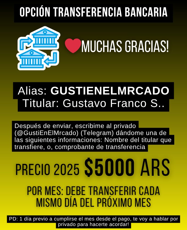 "LIVE 17/10 22:30 "Aftermarket Show" ESPECIAL DE ESTRATEGIAS PRE-ELECTORALES PARA LA COMITENTE Aftermarket Show El microinformativo econmico-burstil y de anlisis tcnico de mercado que NADIE pidi. ----------------------------------------------------------------- Grupo Telegram Gratis: https://t.me/TradingATP 💸 COLABOR CON MI LABURO (el monto es simblico) Y UNITE AL GRUPO PRIVADO CON CUALQUIERA DE ESTAS [--] OPCIONES: 🔹 Opcin Mercado Pago: https://www.mercadopago.com.ar/subscriptions/checkoutpreapproval_plan_id=177fb5339e314d109f5fef9c91683e47 🔹 Opcin Transferencia: https://iili.io/KXozdnp.png"